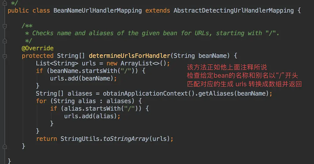 接下来看下 BeanNameUrlHandlerMapping 里面的 determineUrlsForHandler(..) 方法是怎么实现匹对 beanName 是否跟该映射器相关并返回 URLs 的逻辑吧。