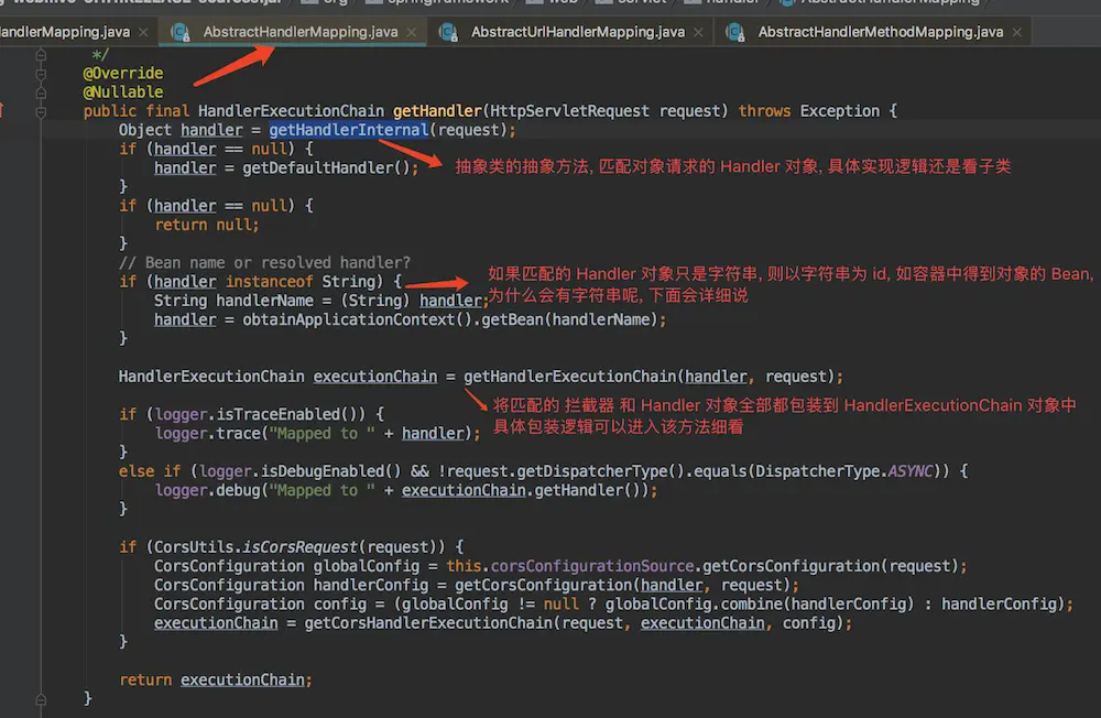在 AbstractHandlerMapping 类中实现 getHandler(..) 接口方法得到 HandlerExecutionChain 对象
