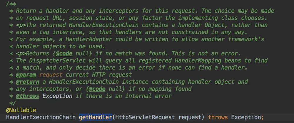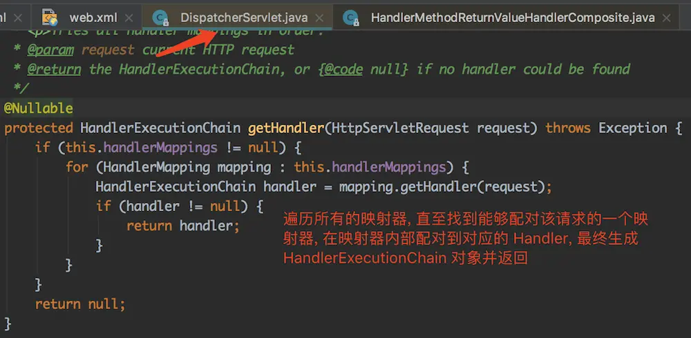 看到这里肯定很模糊,具体 HandlerMapping 内部通过调用 getHandler(..) 得到 HandlerExecutionChain 对象细节请往下看。