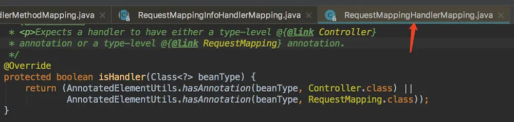 isHandler(..) 是该抽象类定义的抽象方法,由实现类自己去实现匹对哪些类。看下 RequestMappingHandlerMapping 映射器是怎么实现的吧