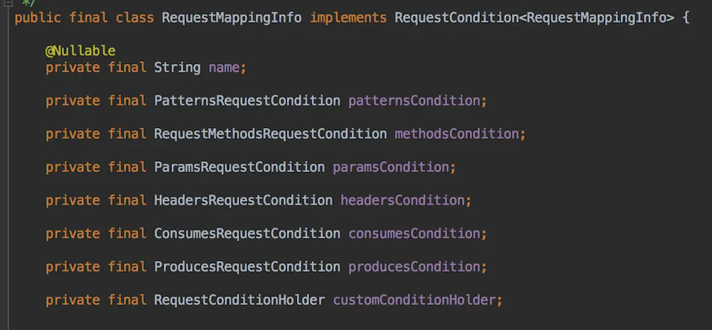 PatternsRequestCondition:模式请求路径过滤器,对应记录和判断@RequestMapping注解上的value属性。RequestMethodsRequestCondition:请求方法过滤器,对应记录和判断@RequestMapping注解上的method属性。ParamsRequestCondition:请求参数过滤器,对应记录和判断@RequestMapping注解上的params属性。HeadersRequestCondition:头字段过滤器,对应记录和判断@RequestMapping注解上的headers属性。ConsumesRequestCondition:请求媒体类型过滤器,对应记录和判断@RequestMapping注解上的consumes属性。ProducesRequestCondition:应答媒体类型过滤器,对应记录和判断@RequestMapping注解上的produces属性。RequestConditionHolder:预留自定义扩展过滤器。