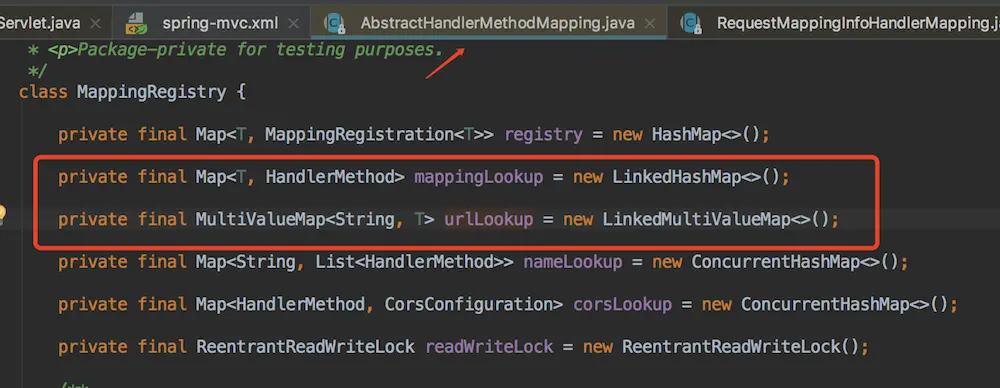 urlLookup:主要用来记录lookupPath请求路径对应的mapping集合。 这里 Spring 留了一个很活的机制,拿@RequestMapping注解来说,他的value属性本身就是一个字符数组,在多重设置中难免有路径重复的,所以最终有可能会出现一个lookupPath对应多个RequestMappingInfo,最终在请求过来的时候给了自定义抽象方法让实现类自己实现择优的方式。MutivalueMap是 SpringMVC 自定义的一个Map类,key 对应的 value 是一个集合,这从名字上也能看出来。 -