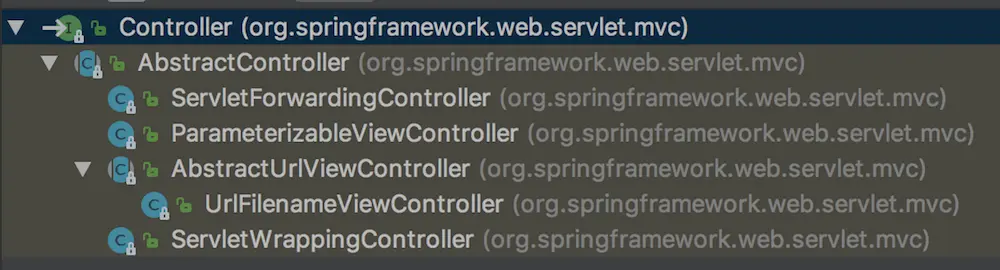 接下来咱们就自定义一个经过该映射器匹对的视图,但是在自定义之前我们需要先了解下 Controller 这个接口。因为使用 AbstractUrlHandlerMapping 的实现类时,需要让控制层的类实现 Controller 接口(一般继承 AbstractController 即可),另外还有一些已经实现了的 Controller 类,如下图所示。但是不论是自己实现 Controller 接口还是继承系统已经实现的类,都只能处理一个请求。