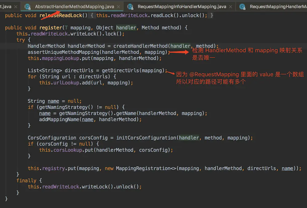 说到这里,可能大家对于这个 this.mappingRegistery 对象十分好奇,里面到底是怎么存储数据的,先是可以根据 lookupPath 找到 List<mapping>,接着后来又根据 mapping 找到 HandlerMethod 对象。