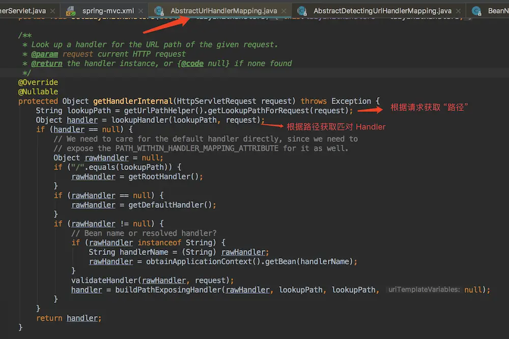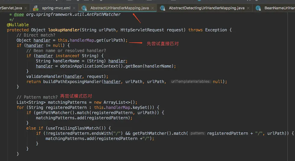跟前面的另一个实现分支 AbstractUrlHandlerMapping 实现看起来差不多,都是根据请求路径来匹对,但是内部配对方式有什么不同还需要我们接着往下看。