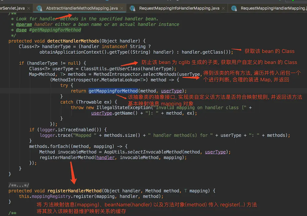 AbstractHandlerMethodMapping 最终获取的 handler 是 HandlerMethod 类型对象。实现该抽象类的子类映射器具体映射什么样的方法,怎么实现请求和方法的映射,该抽象类都给出了抽象接口,可高度自定义[ps: 这里给我印象很深,学到了]。