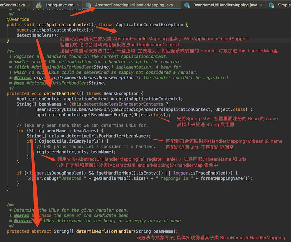 首先来看其父类 AbstractDetectingUrlHandlerMapping 怎么调用 registerHandler(String urlPath, Object handler) 又怎么匹配到配置在容器中的 handler 并将其注入到 AbstractUrlHandlerMapping 的 this.handlerMap 中。