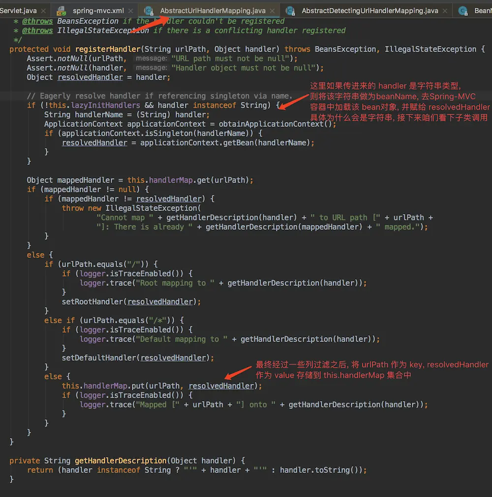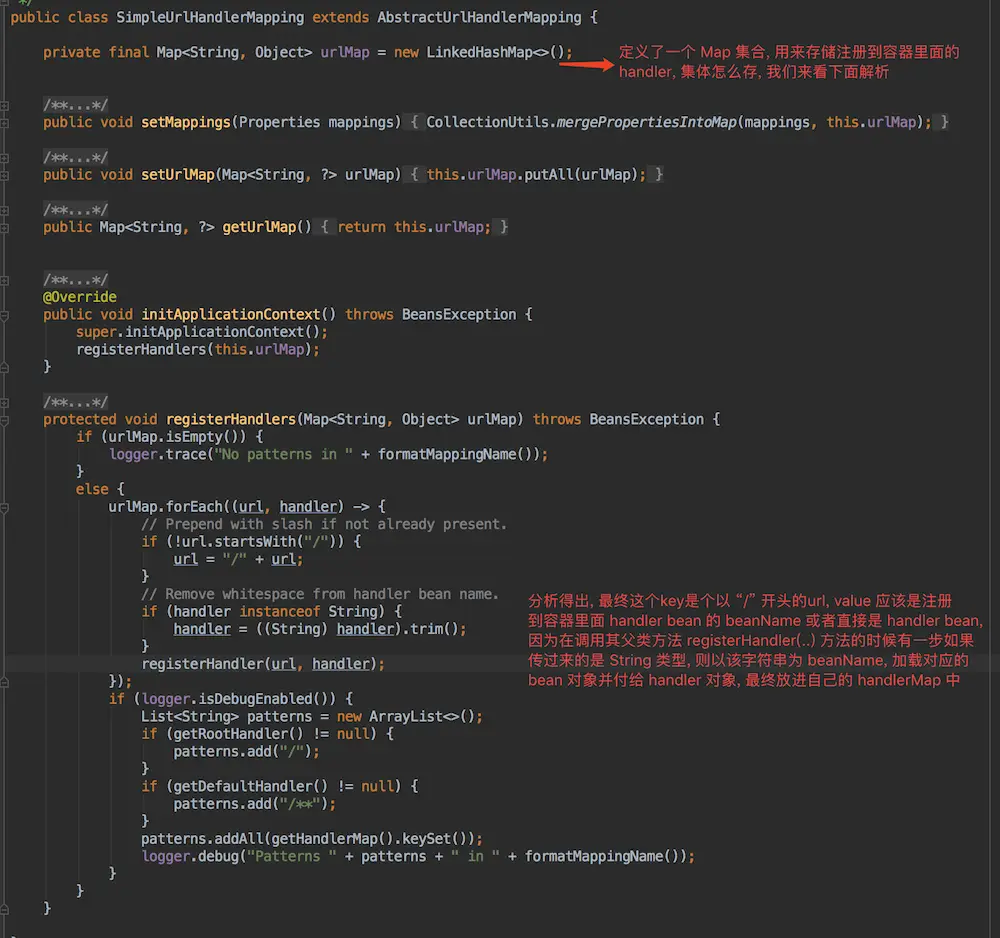 上面代码可以看出从 this.handlerMap 中通过 urlPath 匹对找到对应的 handler 对象。那接下来就看下开始是怎么将 handler 对象加入到 this.handlerMap 集合中是关键。