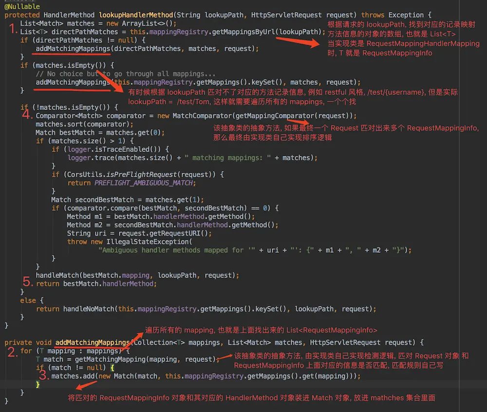 Match就是该抽象类里面自定义的一个内部类,用来记录方法标记信息对象mapping和方法源信息对象HandlerMethod。- 当请求为 restful 风格时,将会遍历所有的 mapping,然后一个个匹对,非常耗时和费资源。优化请参考 springMVC 在 restful 风格的性能优化