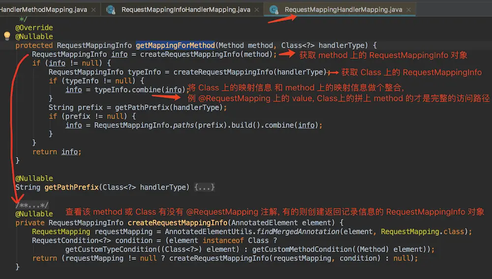 来个分支看下 RequestMappingHandlerMapping 是怎么实现抽象方法 getMappingForMethod(..) 方法的,该映射器都匹配什么样的方法呢?
