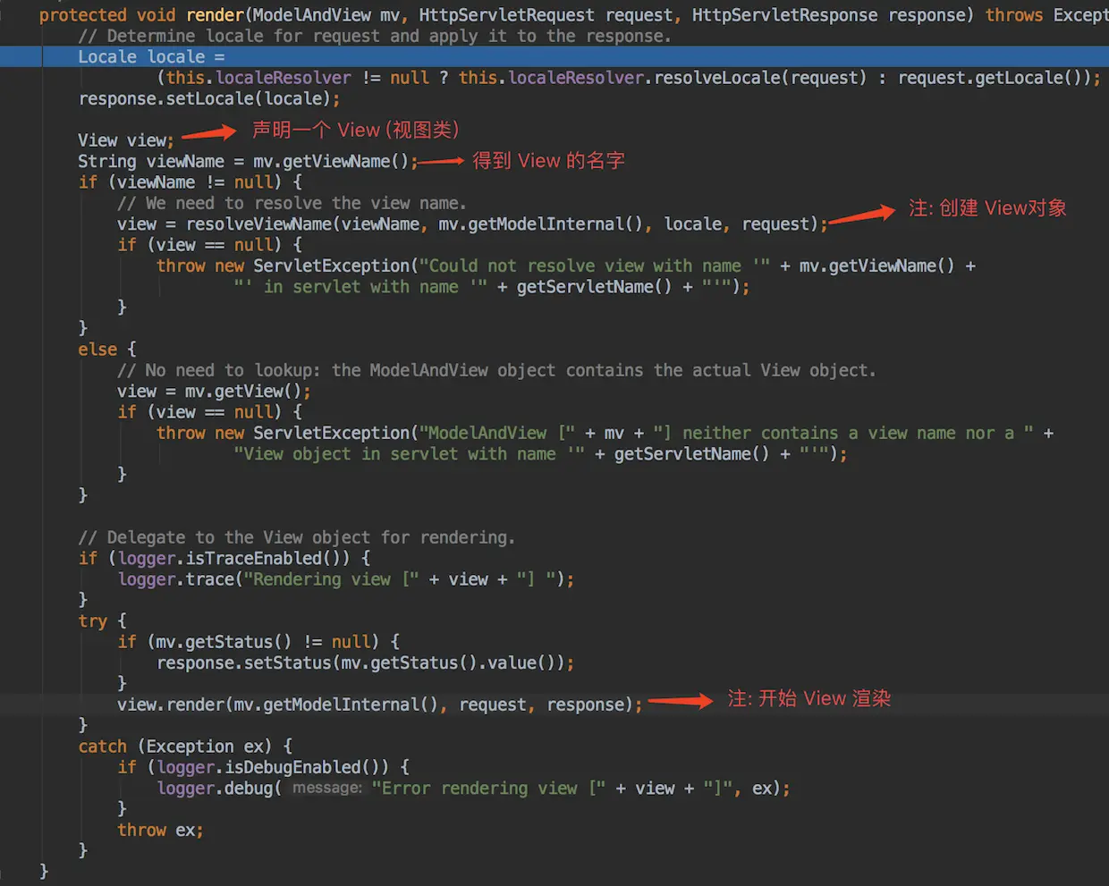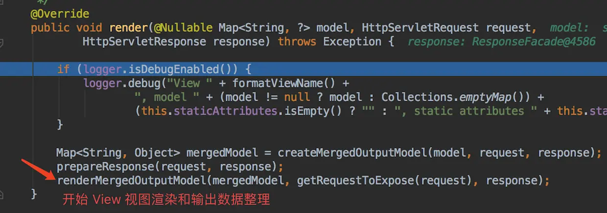 View对象后开始视图上的渲染工作,执行view.render(..)方法,查看视图渲染的具体流程