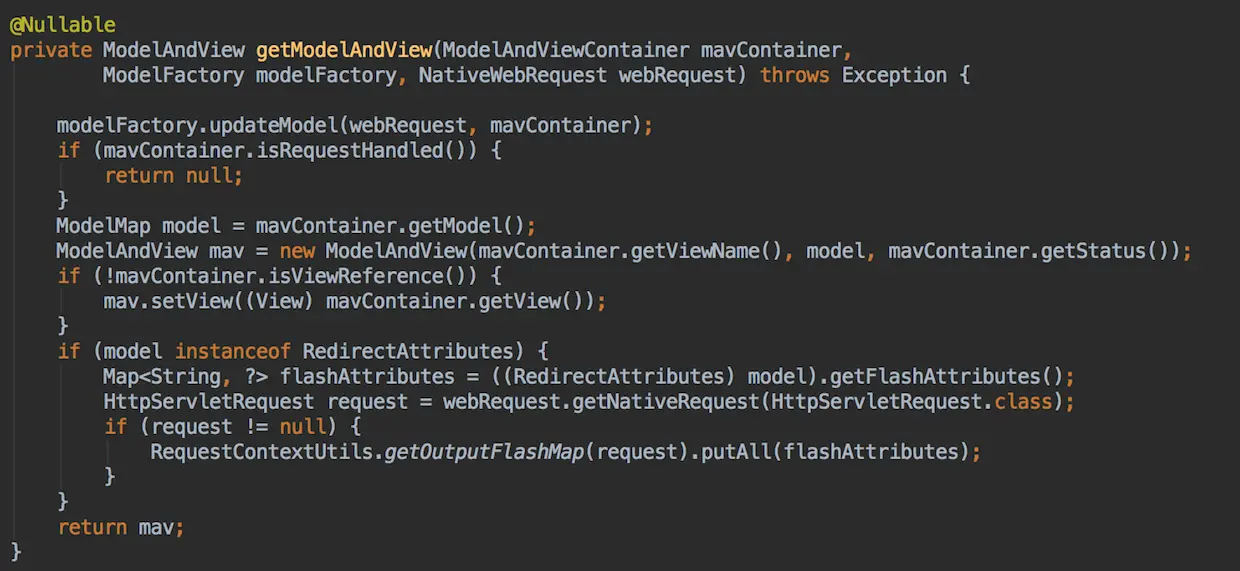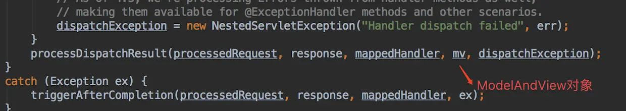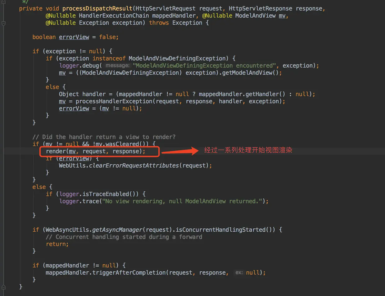 DispatcherServlet.doDispatch( )方法,经过解析处理,找到了对应的Controller里面的方法,执行完成之后得到ModeAndView对象,开始视图渲染前后一些列工作