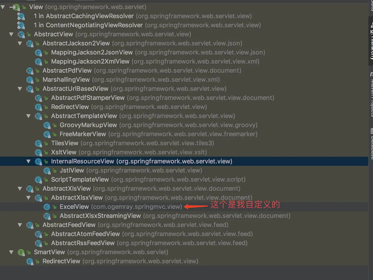注意这里 ModelAndView 模型里面的 view 属性承装的是自定义视图实体,而不是自定义视图的名字,如果直接写成返回视图名字的话需要注入 BeanNameViewResolver 视图解析器。